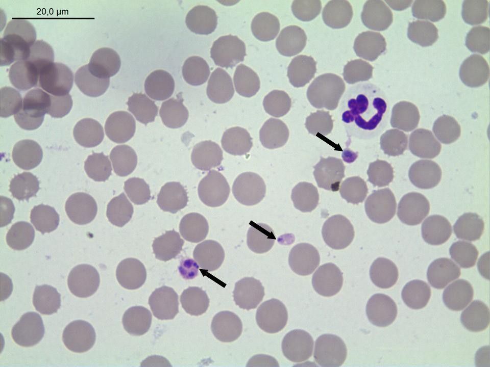 La bacteria infecta plaquetas y es menos patógena, aunque cursa con trombocitopenia y fiebre, que aparece y desaparece de forma cíclica cada una o dos semanas.