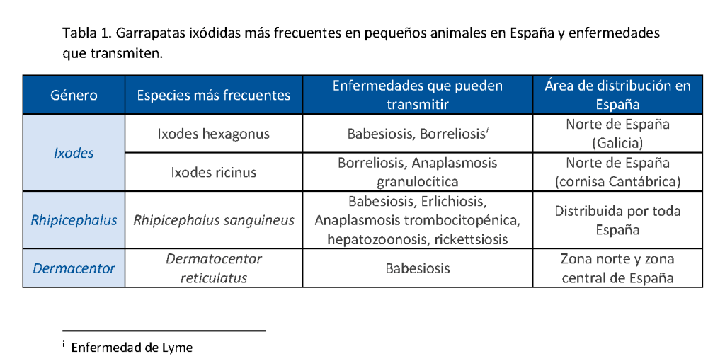 En España son las garrapatas de la familia Ixodidae las que parasitan a nuestros perros y gatos siendo las especies más habituales. Rhipicephalus sanguineus, Dermatocentor reticulatus, Ixodes ricinus e Ixodes hexagonus. Siendo el R. sanguineus la más frecuente.