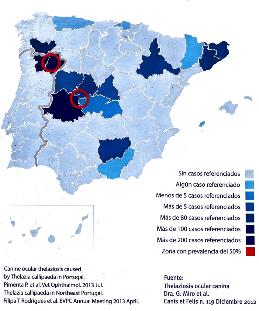 Hoy día su distribución se ha extendido a varias provincias de España, en Madrid ya se han encontrado perros y gatos con Thelazia.